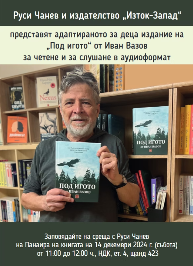 Неотдавна, в нашия център се състоя така наречената от приятели „историческата премиера на книга без книга“. Това беше представянето на „Под игото“ за деца, литературна адаптация, чийто текст се излъчва по програма „Христо Ботев“ на Националното радио. Сега записът е включен в книгата „За българчетата по света артистът Руси Чанев представя „Под игото“ от Иван Вазов“, която се появи на бял свят в луксозното издание на „Изток-Запад“, илюстрирано с 60 рисунки – работи на ученици от Националното училище за изящни изкуства и хонорувани от нашия арт център.